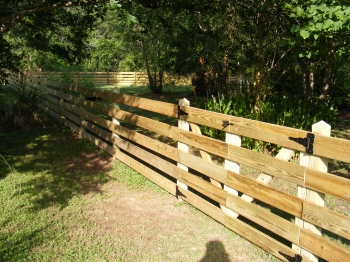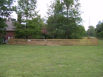 The customer just purchased a pet and wanted to contain it on the back side of the property but wanted it to be pleasing to the eye. KJM suggested wood planking with posts every 6ft and 5 rails.