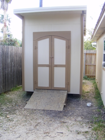 This customer wanted some more space in the garage, and was thinking of expanding the garage. We suggested that it would cost a lot less if we customized a storge shed for his needs. The size came out to be 8' Wide, 9' High, and 12' Long.
