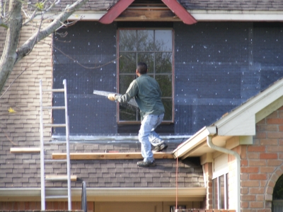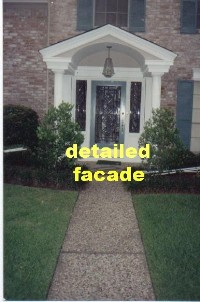 The door and facade is the first impression you get of a house. The house had a mixture of wood and stucco which was crumbling due to moisture. The house is 30 years old. We removed the entire top front of the house, applied plywood, and re-stuccoed. Then we applied a cultured stone. This particular one is a stackable. We got many compliments for the look.