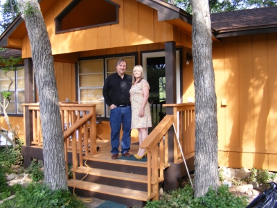 The customer has property on a lake. The cabin they purchased did not have a front porch with cover and railing. They also wanted the top to be open. KJM opened the top portion and stained to match existing.