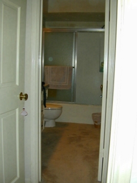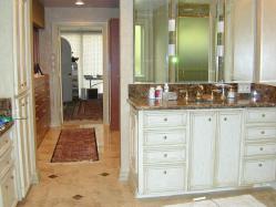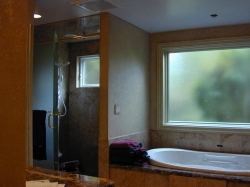 The Master Bathroom was 7ft wide by 9ft long - very small. We wanted to open it up more and we did that by using lighting and installing a small pony (half height) wall between the vanity and the tub with tempered glass. For the vanity, we installed a pedistal sink with a black wrought iron frame on the botton, and shelving for towels. It really opened up the bathroom.