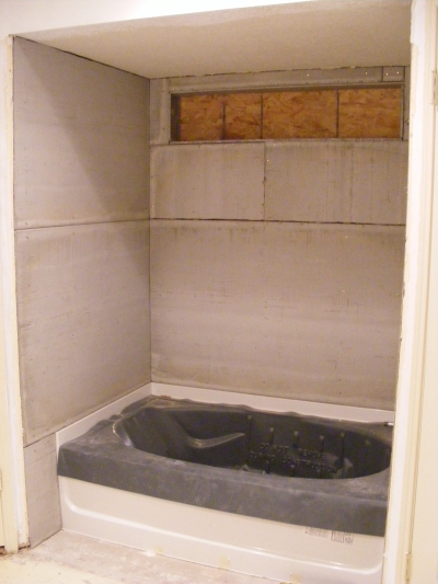 The customer had a small tub in close quarters and he wanted a larger area but was limited by the closets on each side. KJM suggested a window above the tub to bring in light and a garden tub to replace the small standard tub. The garden tub is wider and deeper giving it the feel of a larger area.