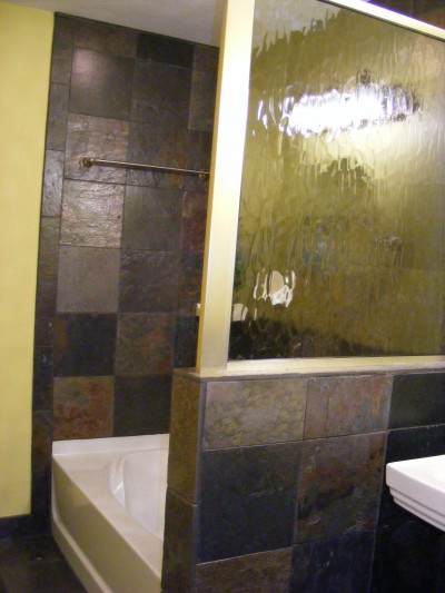 This master bathroom was completely done in slate (floor and shower) with black granite counter tops, gray slate, and an enclosed glass shower with custom fixtures.