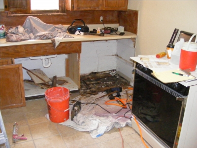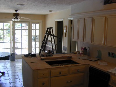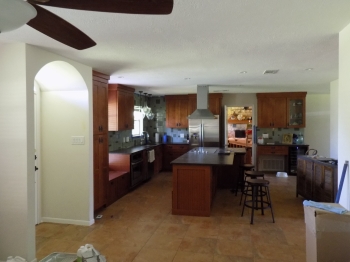 This is one of our kitchen projects: keeping some of the same existing cabinets, removing the island and built in oven cabinets. Building new cabinets to match existing, approximately 64sq feet, installing new vent hood and range, new gas line, new 30 foot, 7 inch diameter exhaust pipe, new 3 compartment stainless sink with granite on counter tops, changed all old lights to recessed flood lights with under mount cabinet spot lights, 18 X 18 ceramic tile floor, and all new fixtures.