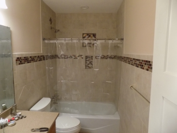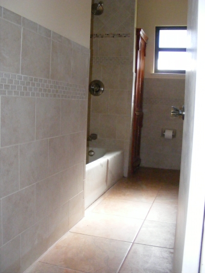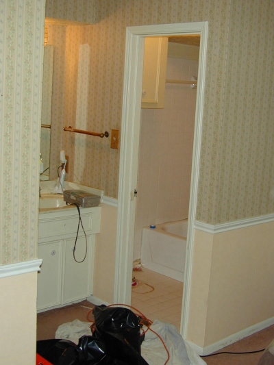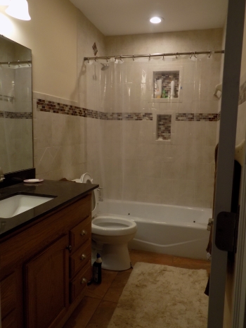 What the customer wanted was to get a fresh look. KJM Construction removed old sheetrock furdowns, wallpaper and the tub. Also resheetrocked, and upgraded with vanity top cabinets, tub, comode, and tile throughout.