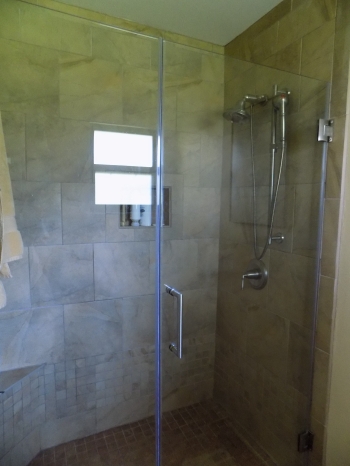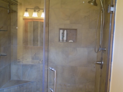 The master bathroom had a small 3 X 3 foot area for the shower. We expanded it to twice the size installing a seat, handheld shower head, glass shelves, and a frameless glass door in the shower.