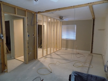 Completely demoed the inside of a 1970 house in the hill country. The kitchen, dining, and living room were all separated by interior walls giving each room a very small area. KJM structually removed all walls and opened the entire area up.